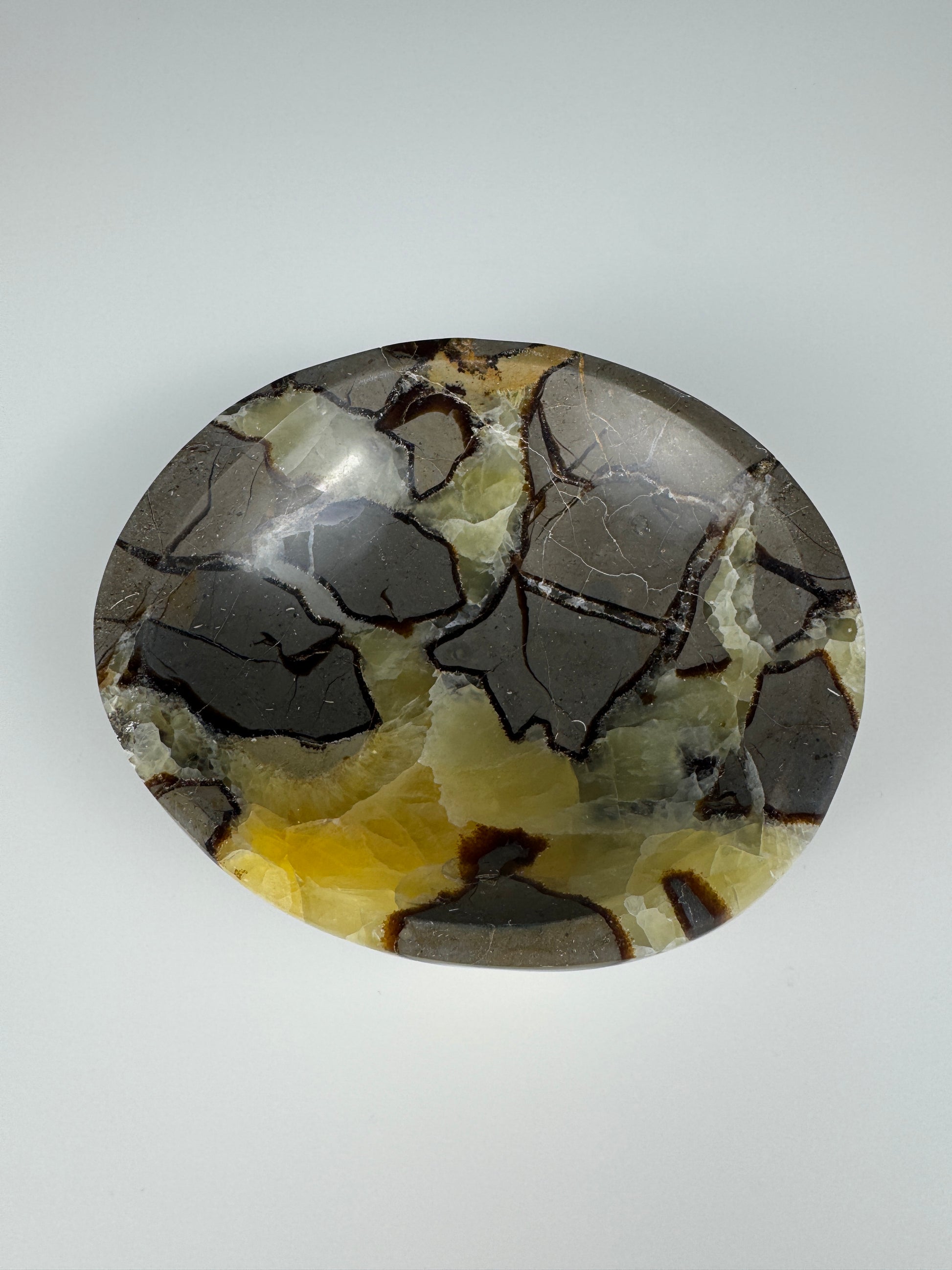 Diese außergewöhnliche Schale wurde aus Drachenstein (Septarie) gefertigt und begeistert mit ihrer einzigartigen Maserung aus erdigen braun und grau Tönen, natürlichem Gelb und sanften Beige-Nuancen. Ein Handgefertigtes Unikat.
